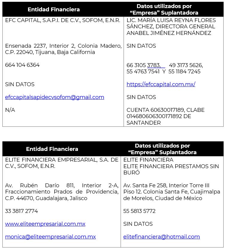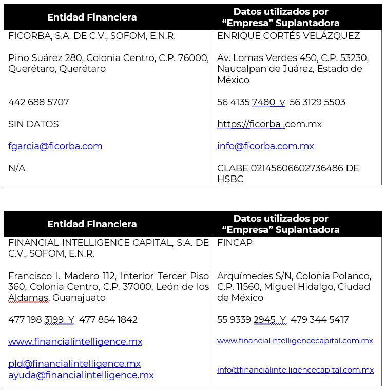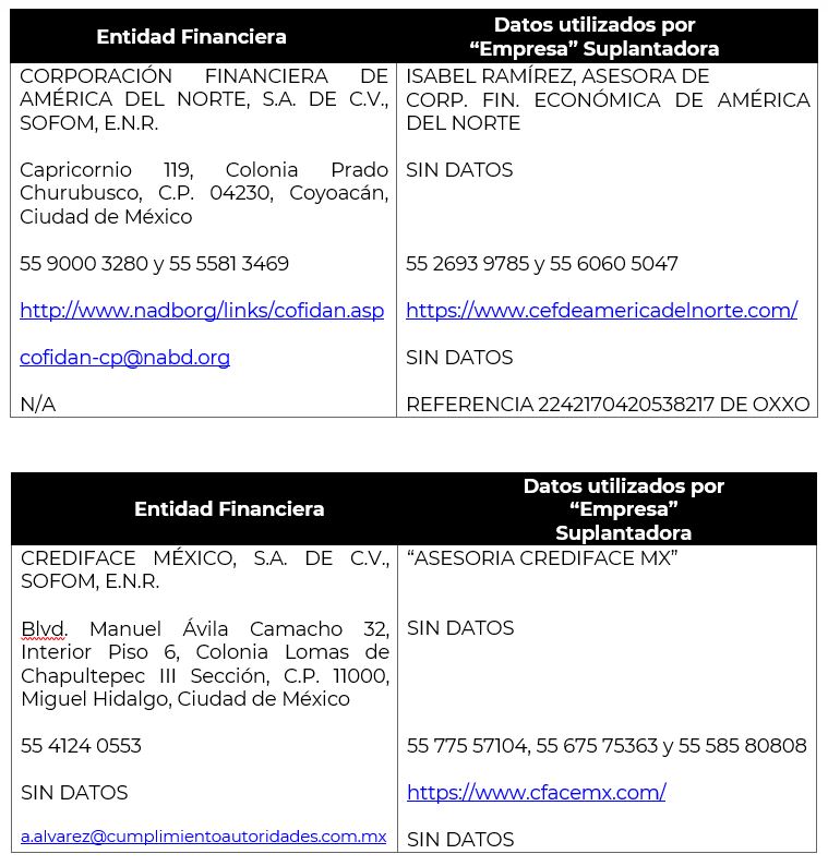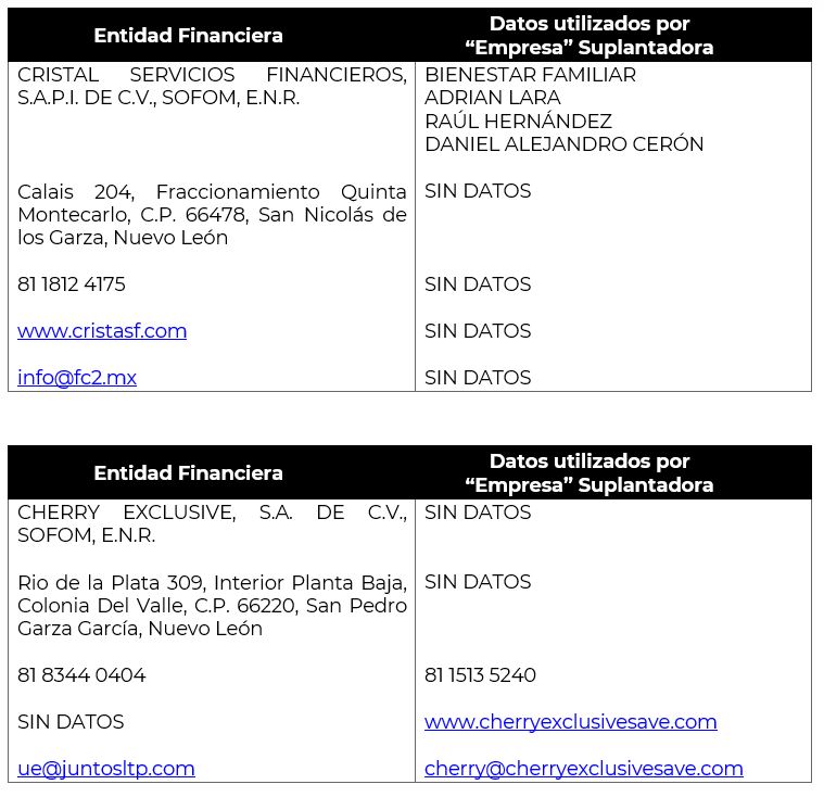 Al mes de febrero de 2024 esta Comisión Nacional contaba con reportes de 22 instituciones financieras que habían sido afectadas por la suplantación o uso indebido y sin autorización de su nombre comercial, denominación, logo e incluso de algunos de sus datos fiscales o administrativos, a las que ahora se suman las 37 instituciones detalladas a continuación: