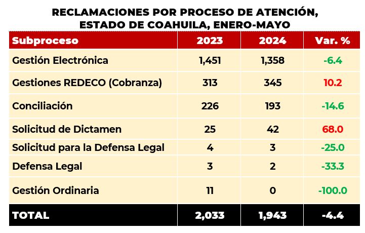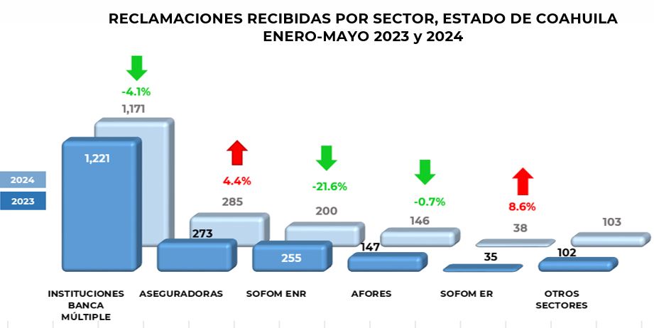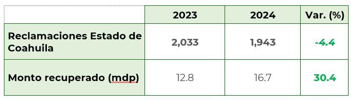 De enero a mayo de 2024, los habitantes del estado de Coahuila, presentaron 1,943 reclamaciones,que significó un decremento del 4.4% con respecto al 2023, cuando se reportaron 2,033 asuntos. Del total de las reclamaciones recibidas a nivel nacional, esta entidad concentró el 1.8%.