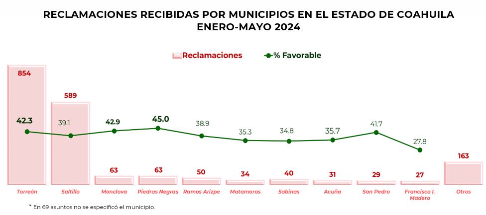 Las reclamaciones recibidas por Condusef en esta entidad se interpusieron por usuarios que habitan en 30 de 38 municipios que lo integran, siendo el municipio de Torreón el que concentró el 44% del total, seguido por Saltillo con el 30.3%.