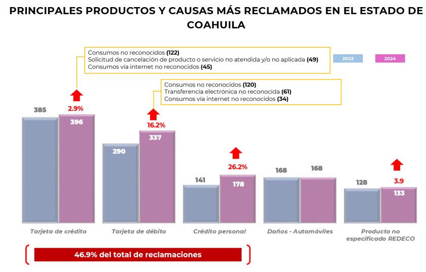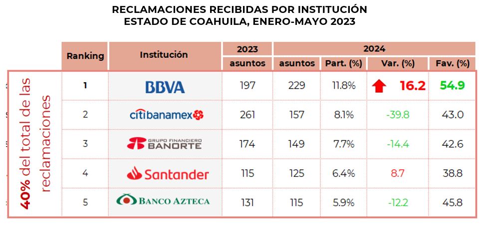 Por su parte, las instituciones que de manera individual registraron el mayor número de reclamaciones en el Estado de Coahuila, fueron: BBVA México, Citibanamex, Banorte, Banco Santander y Banco Azteca que en conjunto concentraron el 40% del total.