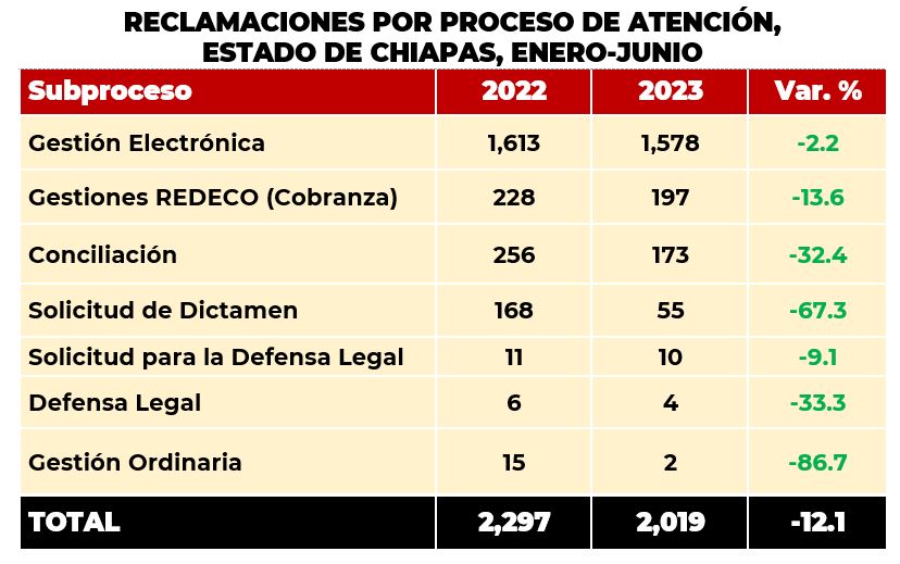La gestión electrónica es un proceso amigable en el que la CONDUSEF trata que la Entidad Financiera proporcione una respuesta puntual y clara al usuario en un corto tiempo; si el usuario no queda conforme, puede presentar su reclamación formal con el fin de obtener una audiencia de conciliación. De no lograrse un arreglo entre las partes, puede solicitar un dictamen y en casos especiales obtener la defensoría legal gratuita, sobre todo si el asunto, a juicio de la CONDUSEF es procedente y el usuario es un adulto mayor, no tiene empleo o tiene algún tipo de discapacidad. La distribución de las reclamaciones por proceso de atención del estado de Chiapas, fue la siguiente: