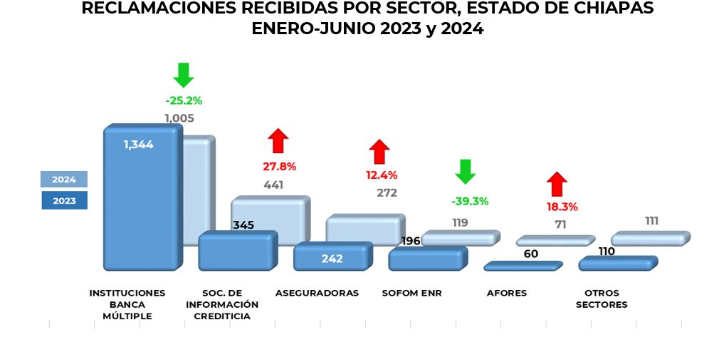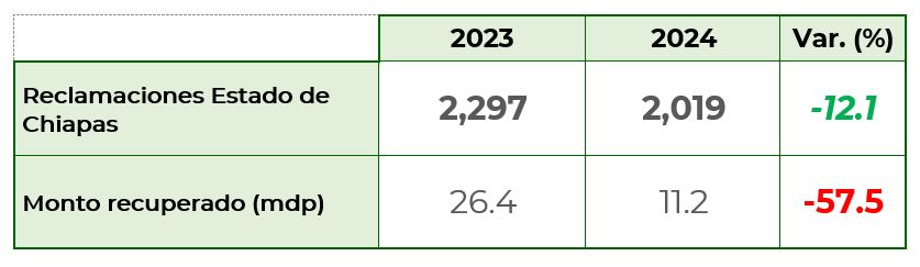 De enero a junio de 2024, los habitantes del estado de Chiapas, presentaron 2,019 reclamaciones,que significó un decremento del 12.1% con respecto al 2023, cuando se reportaron 2,297 asuntos. Del total de las reclamaciones recibidas a nivel nacional, esta entidad concentró el 1.5%.