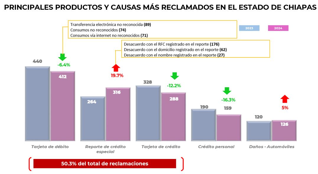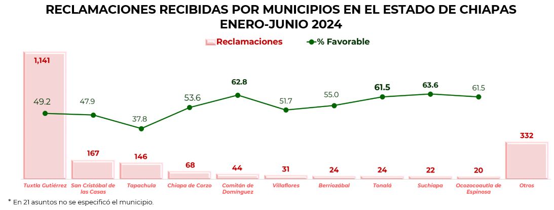 Los municipios que registraron el mayor % de resolución a favor del usuario fueron: Suchiapa 63.6, seguido de Comitán de Domínguez con el 62.8 y Tonalá con 61.5%. Con respecto a los productos más reclamados en el periodo, fueron; asuntos relacionados con Tarjeta de débito, Reporte de crédito especial y Tarjeta de crédito, que en conjunto representaron el 50.3% del total de las reclamaciones en esta entidad.