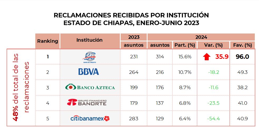 Por su parte, las instituciones que de manera individual registraron el mayor número de reclamaciones en el Estado de Chiapas, fueron: Trans Union de México (Buró de Crédito), BBVA México, Banco Azteca, Banorte y Citibanamex que en conjunto concentraron el 48% del total.