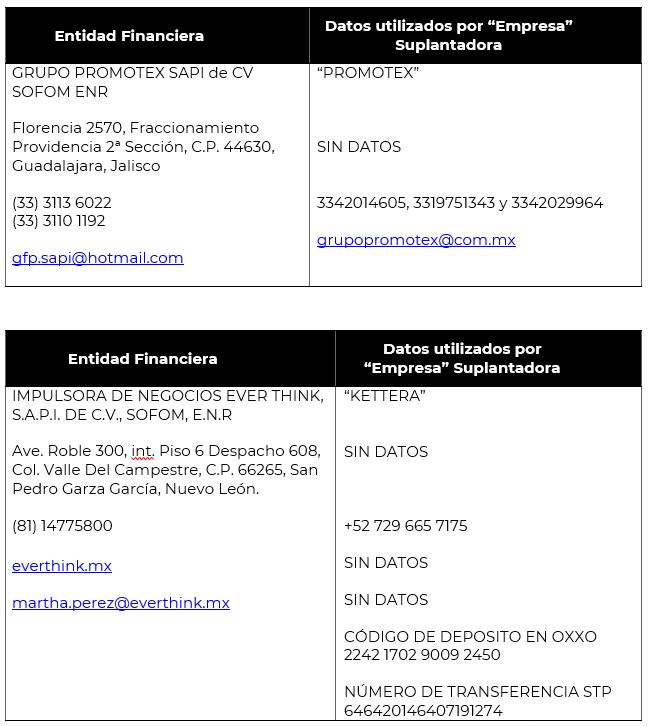 RELACIÓN DE INSTITUCIONES QUE HAN INFORMADO SER SUPLANTADAS Y DATOS PROPORCIONADOS RESPECTO DE TERCEROS QUE PRESUNTAMENTE SE OSTENTAN COMO ENTIDAD O TERCEROS QUE SEÑALAN ESTAR RELACIONADOS CON ESTOS: