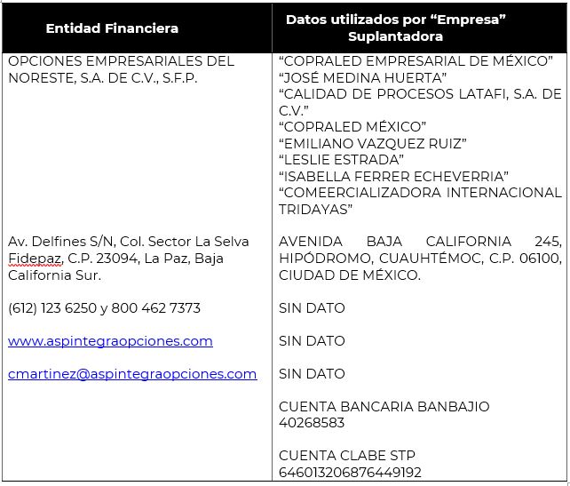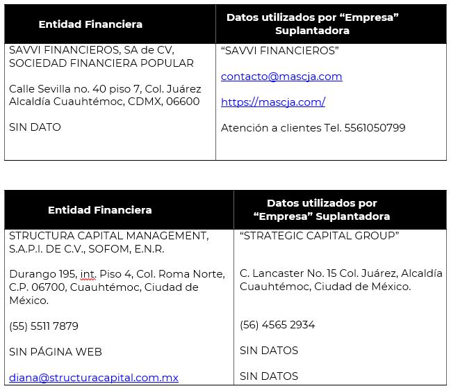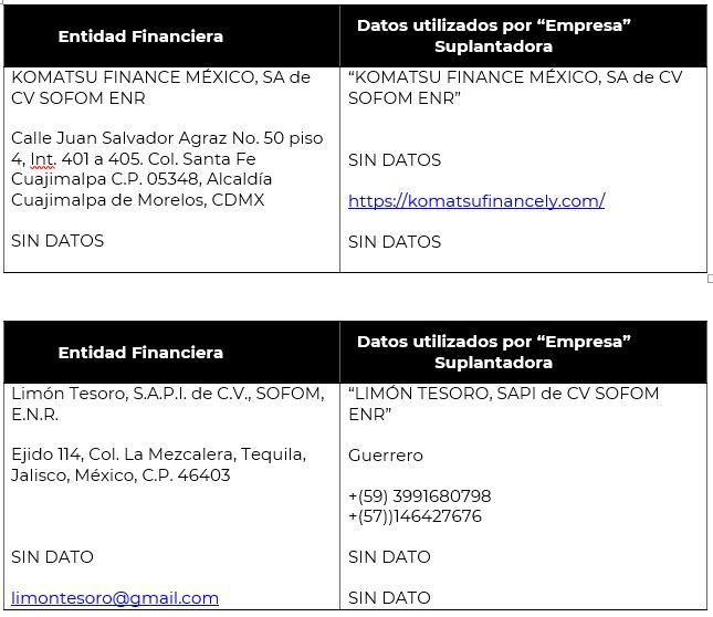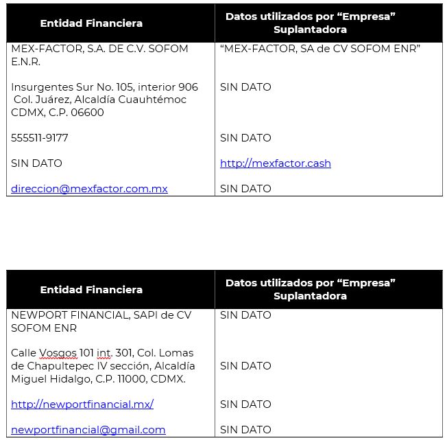 Al mes de abril de 2024 esta Comisión Nacional contaba con reportes de 59 instituciones financieras que habían sido afectadas por la suplantación o uso indebido y sin autorización de su nombre comercial, denominación, logo e incluso de algunos de sus datos fiscales o administrativos, a las que ahora se suman las 49 instituciones, de las cuales 41 entidades son SOFOM, E.N.R., dos Sociedades Cooperativas de Ahorro y Préstamo, otras 2 Sociedades Financieras Populares, una Afore, una Institución de Seguros, una Institución de Financiamiento Colectivo y otra más de Fianzas, mismas que se detallan a continuación:
