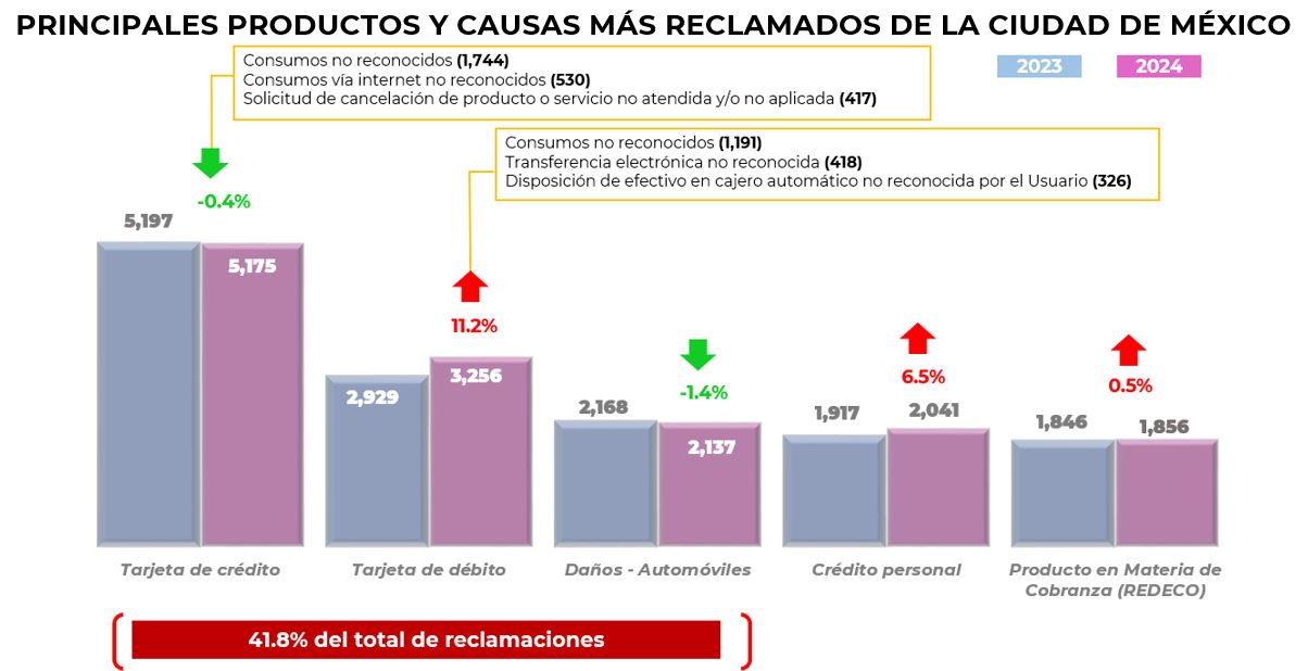 Por su parte, las instituciones que de manera individual registraron el mayor número de reclamaciones en la Ciudad de México, fueron: BBVA México, Citibanamex, Banco Azteca, Santander México y HSBC que en conjunto concentraron el 48% del total.
