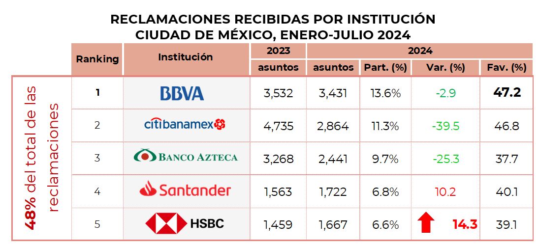De las 5 instituciones con mayor número de reclamaciones de la entidad, destacó HSBC con un aumento del 14.3% en relación al mismo periodo de 2023, BBVA México fue quien resolvió más a favor del usuario con el 47.2%.