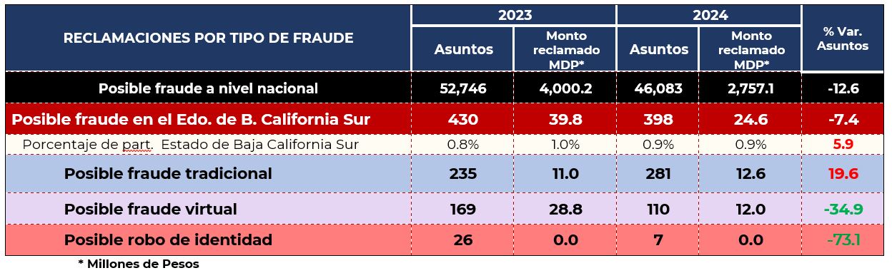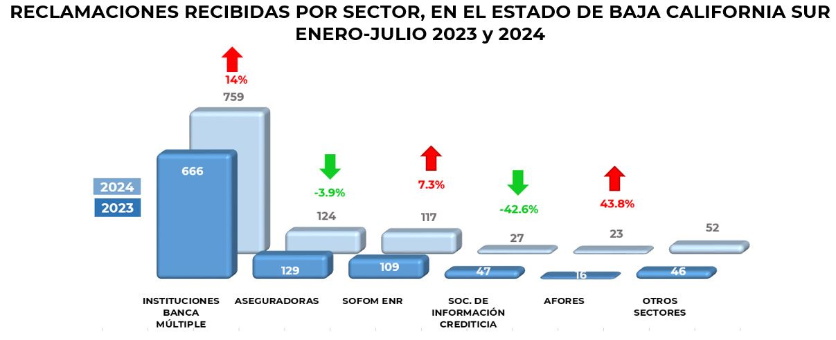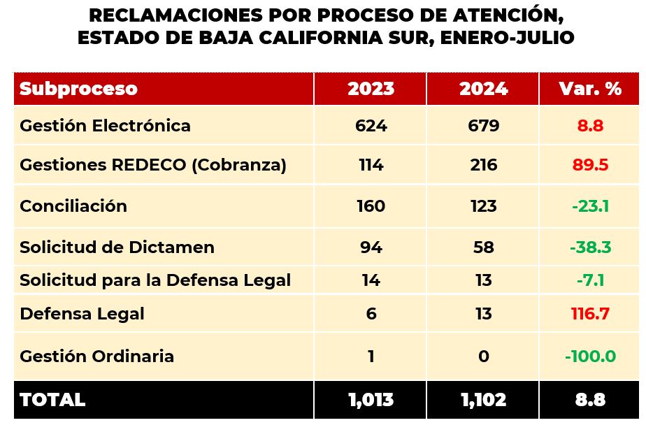 De enero a julio de 2024, los habitantes del estado de Baja California Sur presentaron 1,102 reclamaciones, a través de la Unidad de Atención a Usuarios ubicada en Baja California en el municipio de La Paz, lo que significó un incremento de 8.8% con respecto al mismo periodo de 2023, cuando se reportaron 1,013 asuntos. Del total de las reclamaciones recibidas a nivel nacional, esta entidad concentró el 0.8%.