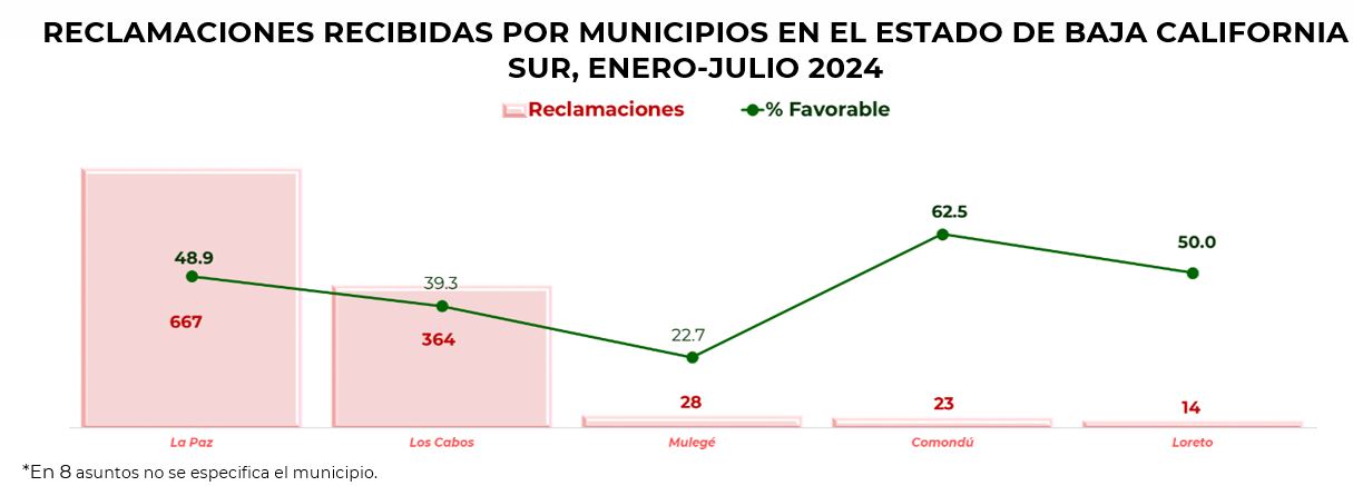 Las reclamaciones recibidas por CONDUSEF en esta entidad se interpusieron por usuarios que habitan en los 5 municipios que la integran, siendo el municipio de La Paz quien concentró el 60.5% del total, seguido por Los Cabos con el 33%.