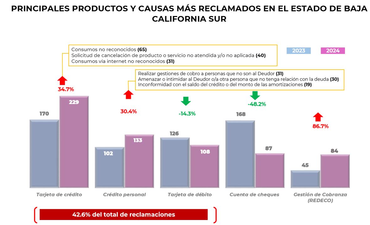 Los municipios que registraron el mayor % de resolución a favor del usuario fueron: Comondú con el 62.5%, seguido de Loreto con el 50% y La Paz con el 48.9%. Con respecto a los productos más reclamados en el periodo, fueron; asuntos relacionados con la Tarjeta de crédito, el Crédito personal y la Tarjeta de Débito que en conjunto representaron el 42.6% del total de las reclamaciones en esta entidad.