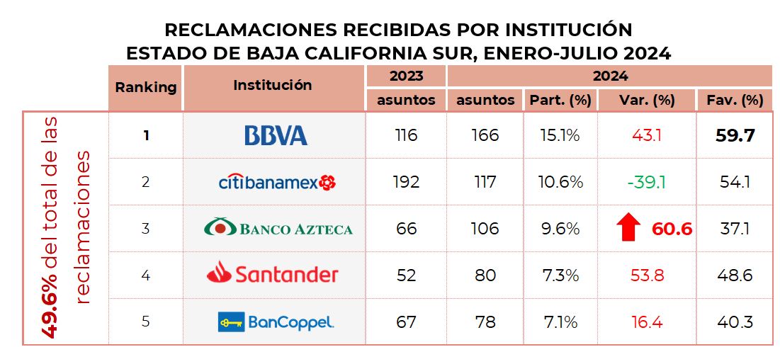 Por su parte, las instituciones que de manera individual registraron el mayor número de reclamaciones en el estado de Baja California Sur, fueron: BBVA México, Citibanamex, Banco Azteca, Santander México y Bancoppel que en conjunto concentraron el 49.6% del total.