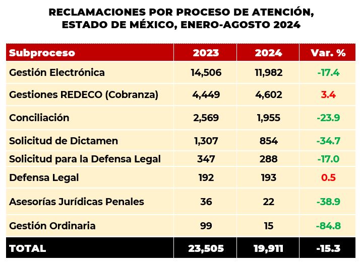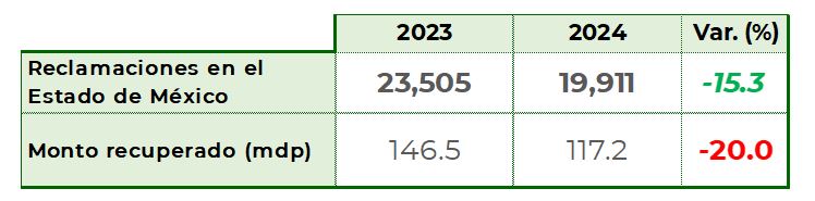 De enero a agosto de 2024, de esta entidad se recuperó de las reclamaciones con importe monetario, un total de 117.2 millones de pesos, lo que significó un decremento del 20% con respecto a lo recuperado en el mismo periodo de 2023, también como resultado de un menor número de reclamaciones de carácter monetario.