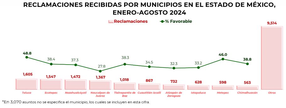 Las reclamaciones recibidas por CONDUSEF en esta entidad se interpusieron por usuarios que habitan en los 125 municipios que lo integran, siendo el municipio de Toluca quien concentró el 8.1% del total, seguido por Ecatepec con el 7.8%.