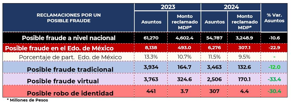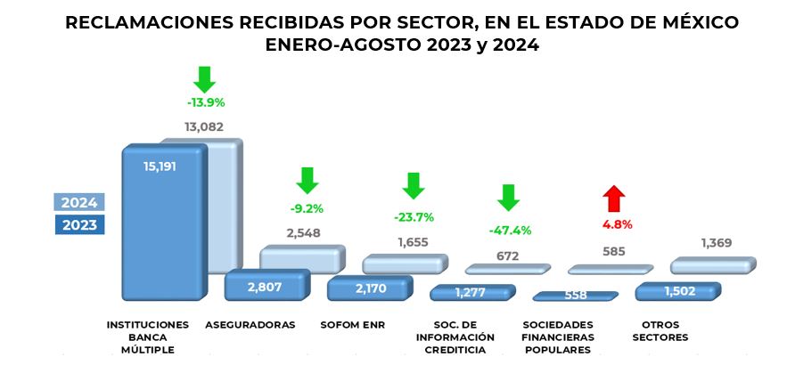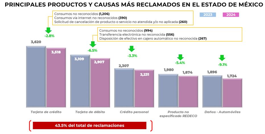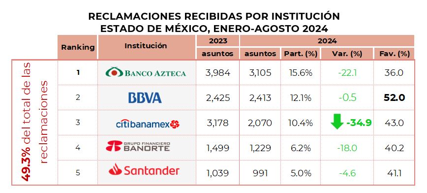 Por su parte, las instituciones que de manera individual registraron el mayor número de reclamaciones en el Estado de México, fueron: Banco Azteca, BBVA México, Citibanamex, Banorte y Santander México que en conjunto concentraron el 49.3% del total.