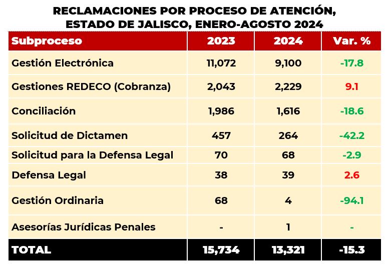 De enero a agosto de 2024, los habitantes del estado de Jalisco presentaron 13,321reclamaciones, a través de la Unidad de Atención a Usuarios ubicada en el municipio de Guadalajara, lo que significó un decremento del 15.3% con respecto al mismo periodo de 2023, cuando se reportaron 15,734 asuntos. Del total de las reclamaciones recibidas a nivel nacional, esta entidad concentró el 7.7%.