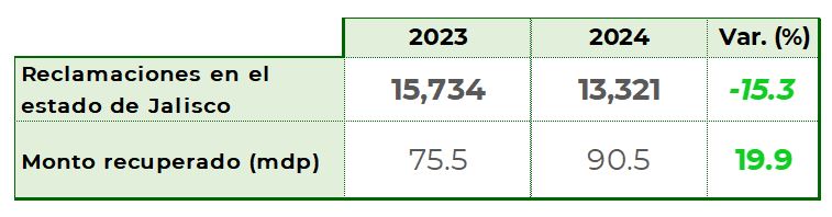 De enero a agosto de 2024, de esta entidad se recuperó de las reclamaciones con importe monetario, un total de 90.5 millones de pesos, lo que significó un aumento del 19.9% con respecto a lo recuperado en el mismo periodo de 2023, a pesar de que se presentó un menor número de reclamaciones de carácter monetario.