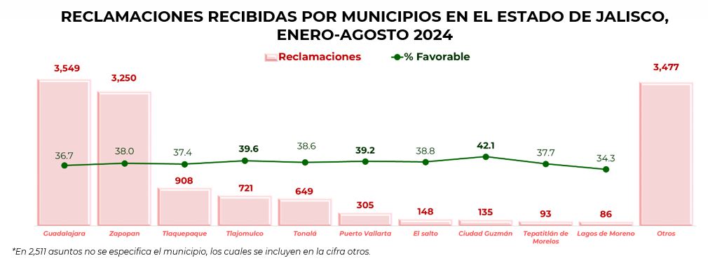 Los municipios que registraron el mayor % de resolución a favor del usuario fueron: Ciudad Guzmán con el 42.1%, seguido de Tlajomulco con el 39.6% y Puerto Vallarta con el 39.2%. Con respecto a los productos más reclamados en el periodo, fueron; asuntos relacionados con la Tarjeta de crédito, la Tarjeta de Débito y el Crédito personal que en conjunto representaron el 54.5% del total de las reclamaciones en esta entidad.