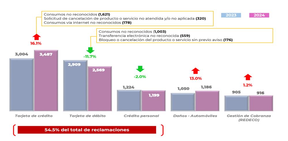 De las 5 instituciones con mayor número de reclamaciones de la entidad, destacó Santander México con un aumento del 34.9% en relación al mismo periodo de 2023 y Citibanamex fue quien resolvió más a favor del usuario con el 45.7%.