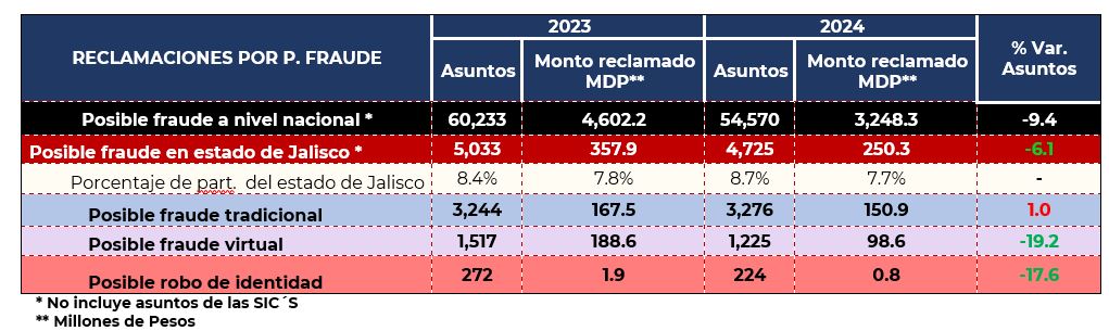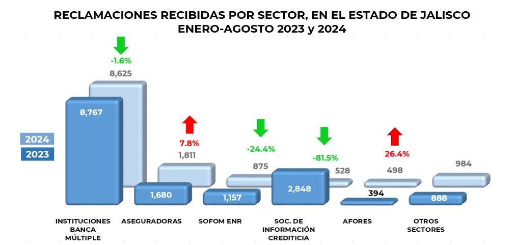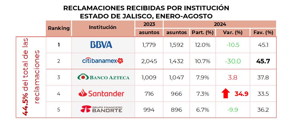 Por su parte, las instituciones que de manera individual registraron el mayor número de reclamaciones en el estado de Jalisco, fueron: BBVA México, Citibanamex, Banco Azteca, Santander México y Banorte que en conjunto concentraron el 44.5% del total.