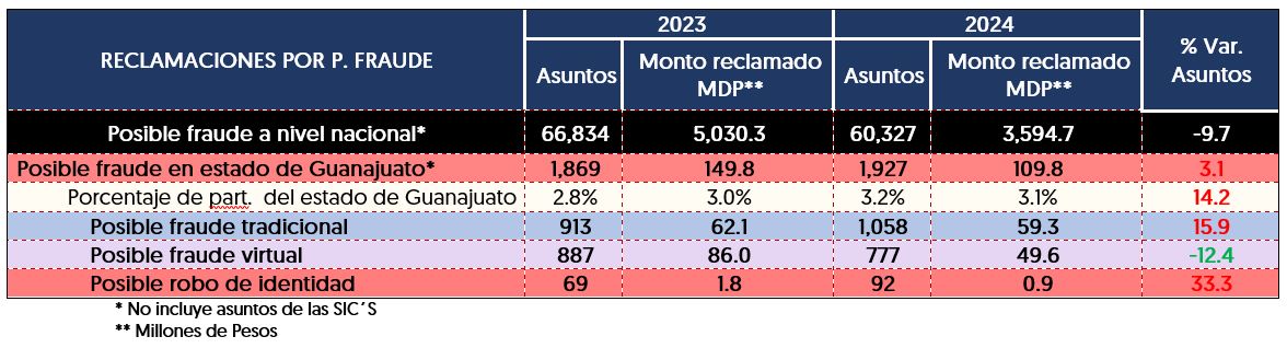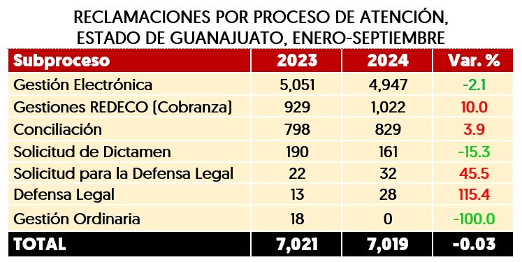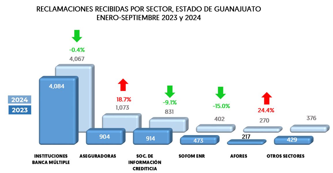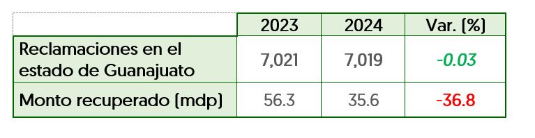 De enero a septiembre de 2024, los habitantes del estado de Guanajuato presentaron 7,019 reclamaciones,que significó un decremento del 0.03% con respecto al 2023, cuando se reportaron 7,021 asuntos. Del total de las reclamaciones recibidas a nivel nacional, esta entidad concentró el 3.6%.
