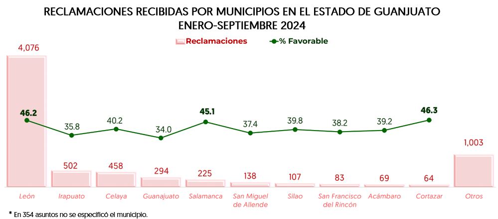 Las reclamaciones recibidas por CONDUSEF en esta entidad se interpusieron por usuarios que habitan en 40 de los 46 municipios que lo integran, siendo el municipio de León el que concentró el 58.1% del total, seguido por Irapuato con el 7.2%.