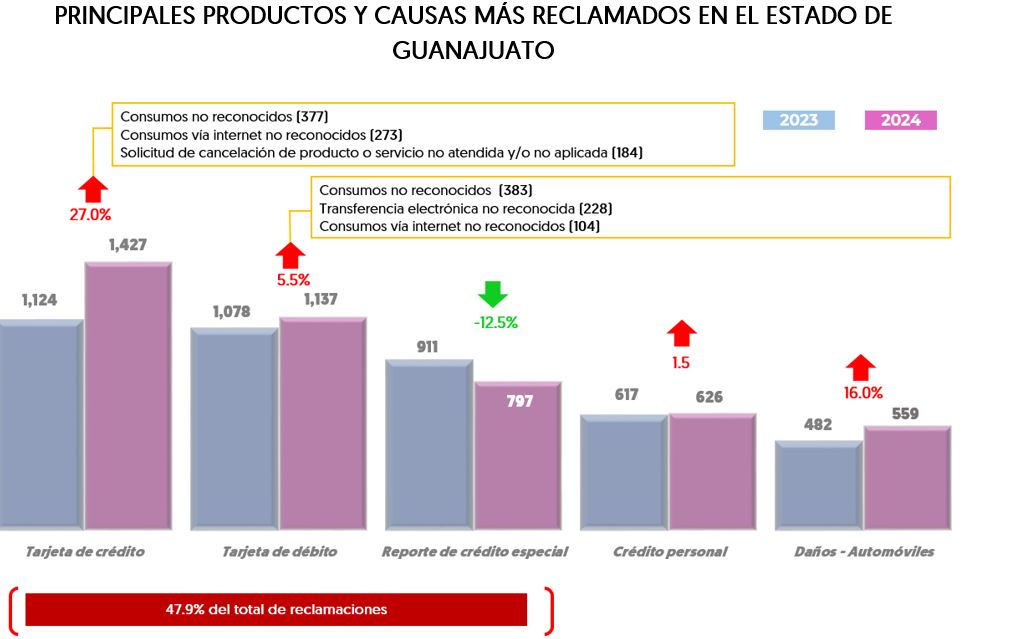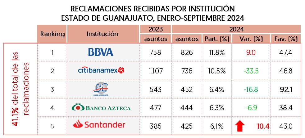 Por su parte, las instituciones que de manera individual registraron el mayor número de reclamaciones en el estado de Guanajuato, fueron: BBVA México, Citibanamex, Trans Union de México (Buró de Crédito), Banco Azteca y Santander México, que en conjunto concentraron el 41.1% del total.