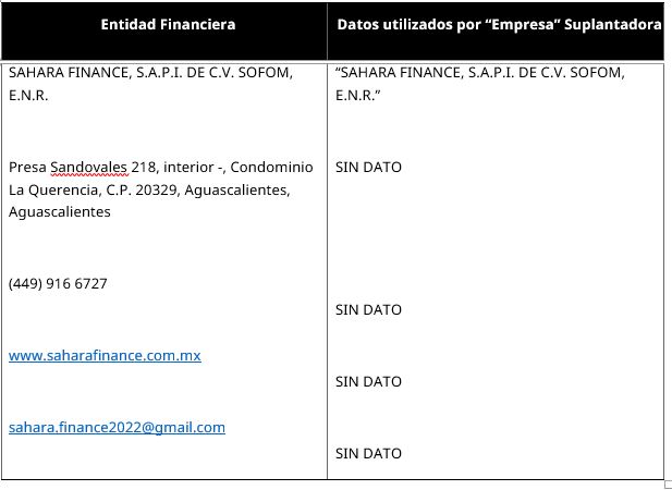 - SAHARA FINANCE, S.A.P.I. DE C.V. SOFOM, E.N.R.