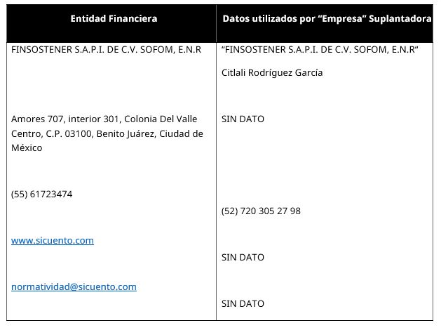 - Utilizan (sin autorización), nombres comerciales, denominaciones sociales y/o imagen corporativa de las entidades financieras debidamente autorizadas y registradas, para hacerse pasar por ellas, cambiando una letra o letras del nombre, colores o formas de los logotipos, para engañar, este uso se hace tanto por medios convencionales, en folletos, como en medios digitales (páginas de internet, redes sociales, aplicaciones móviles, etc.).