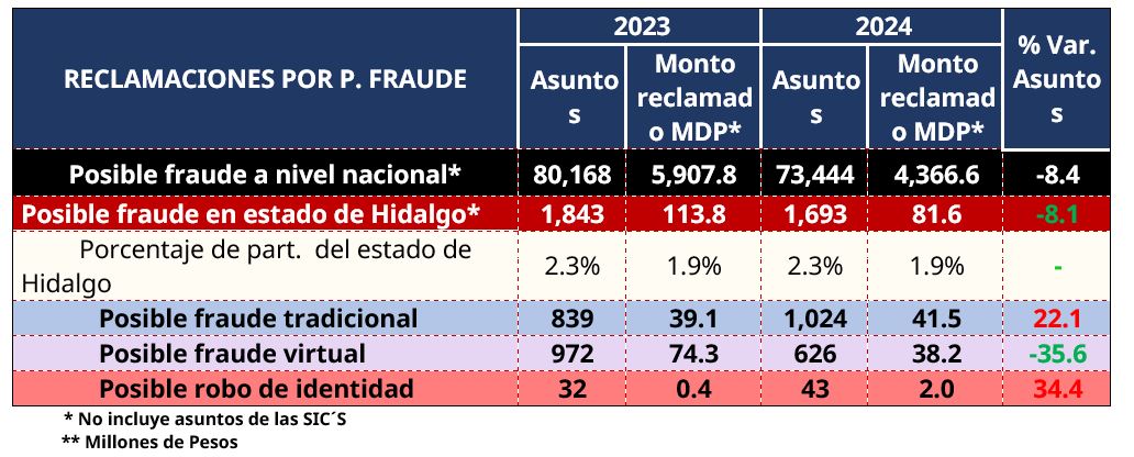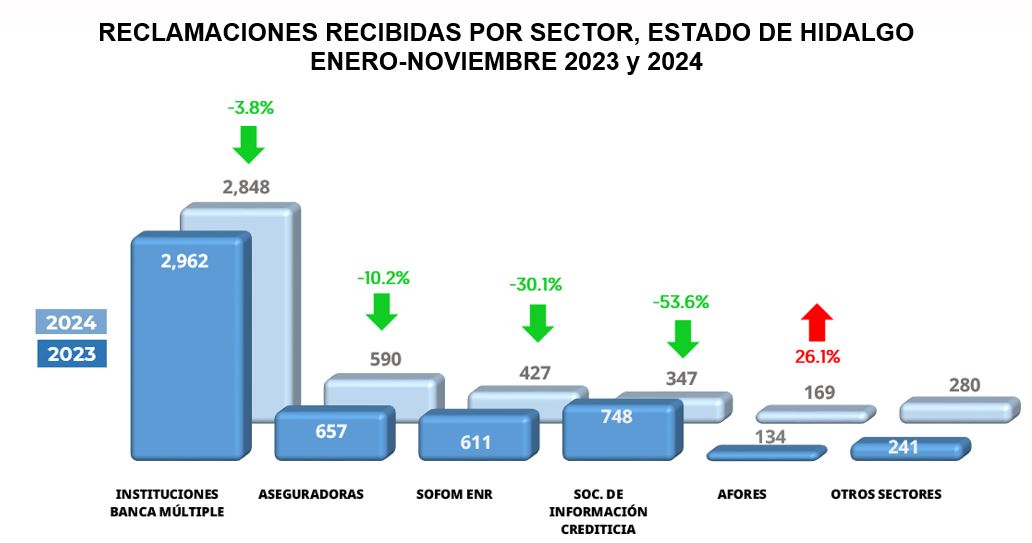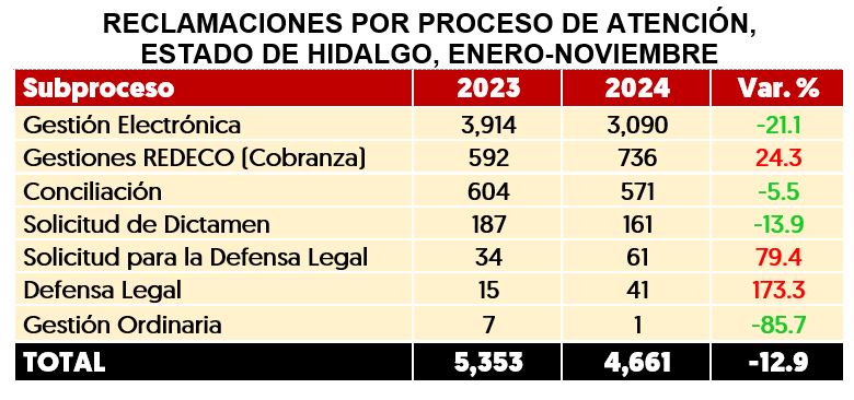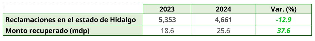 De enero a noviembre de 2024, los habitantes del estado de Hidalgo presentaron 4,661 reclamaciones,que significó un decremento de 12.9% con respecto al 2023, cuando se reportaron 5,353 asuntos. Del total de las reclamaciones recibidas a nivel nacional, esta entidad concentró el 2.0%.