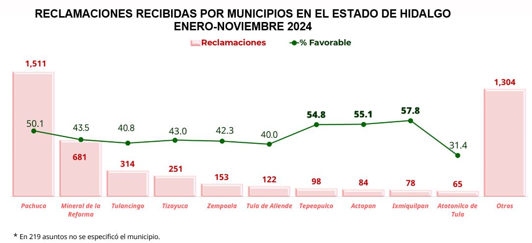 Las reclamaciones recibidas por CONDUSEF en esta entidad se interpusieron por usuarios de 79 de 84 municipios que lo integran, siendo Pachuca el que concentró el 32.4% del total, seguido por Mineral de la Reforma con el 14.6%.