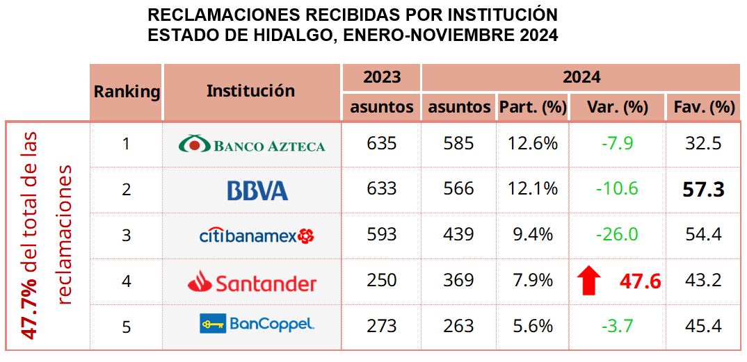 Por su parte, las instituciones que de manera individual registraron el mayor número de reclamaciones en el estado de Hidalgo, fueron: Banco Azteca, BBVA, Citibanamex, Santander y Bancoppel que en conjunto concentraron el 47.7% del total.