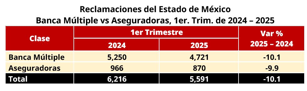 De éstas, 4,721 fueron para la banca y 870 para las aseguradoras, las cuales en conjunto mostraron una disminución de 10.1% con respecto al mismo periodo de 2024. Este estado concentró el 11.2% del total de las reclamaciones a nivel nacional para estos dos sectores.