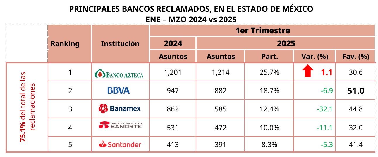 Cinco instituciones bancarias concentraron el 75.1% de las reclamaciones, que son las siguientes:
