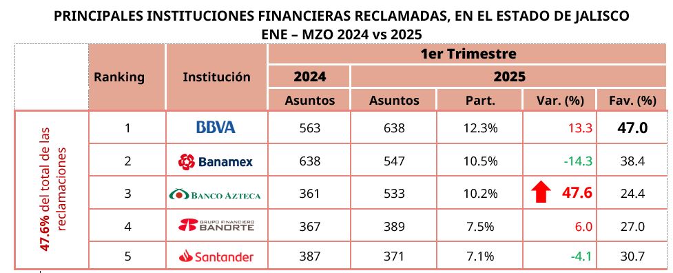 En enero a marzo de 2025 se logró recuperar un monto de 15.8 millones de pesos, lo que significó 38.3% menos que en 2024. Los productos más reclamados fueron: la tarjeta de crédito, la tarjeta de débito y el crédito personal que en conjunto representaron el 59.4% del total en esa entidad.