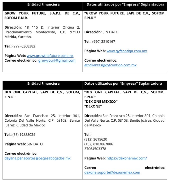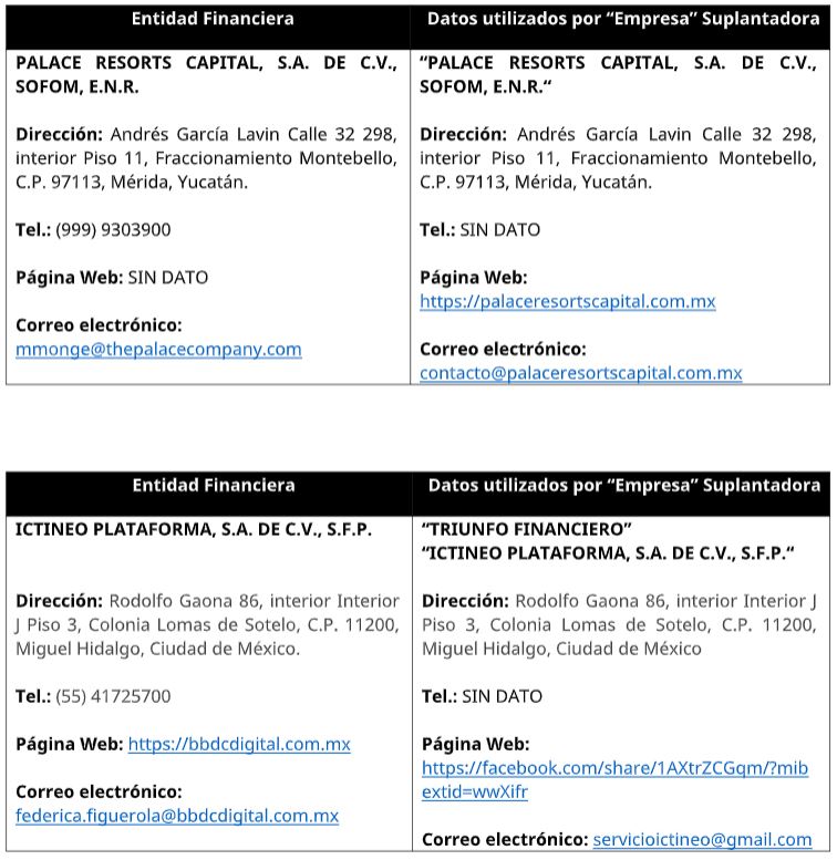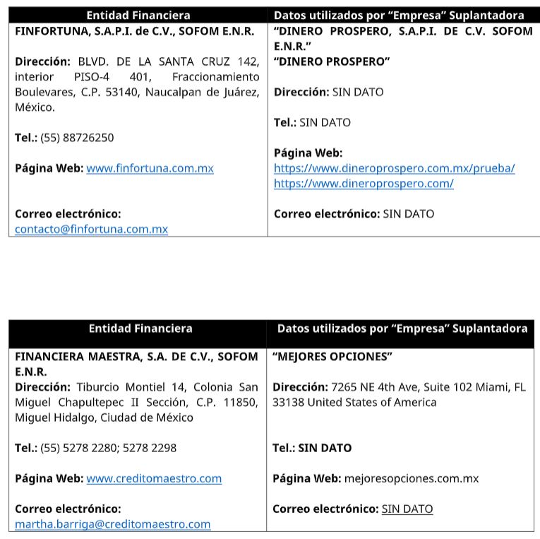 Durante el mes de mayo de 2025 esta Comisión Nacional recibió 10 reportes deinstituciones financieras que fueron afectadas por la suplantación o usoindebido y sin autorización de su nombre comercial, denominación, logo eincluso de algunos de sus datos fiscales o administrativos: