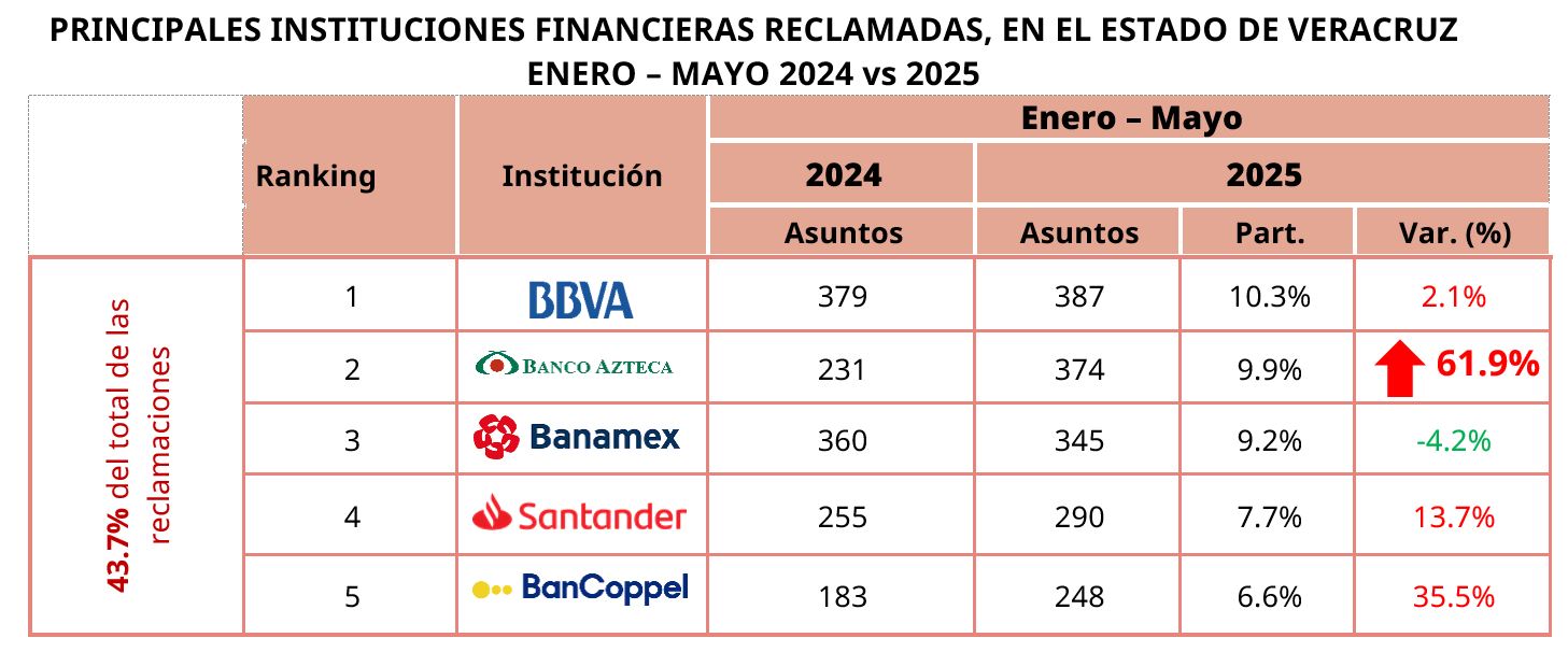 De enero a mayo de 2025, el monto reclamado asciende a 143.6 millones de pesos, lo que significó un incremento de 0.3% con respecto al mismo periodo de 2024. Los productos más reclamados fueron: la tarjeta de débito, la tarjeta de crédito y el crédito personal, que en conjunto representaron el 50.7% del total en esa entidad.