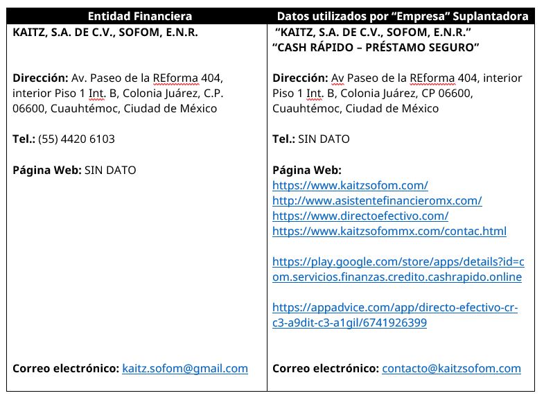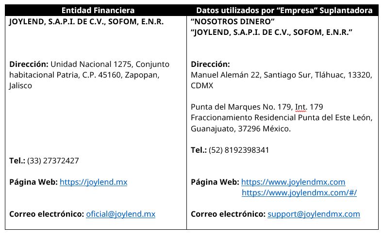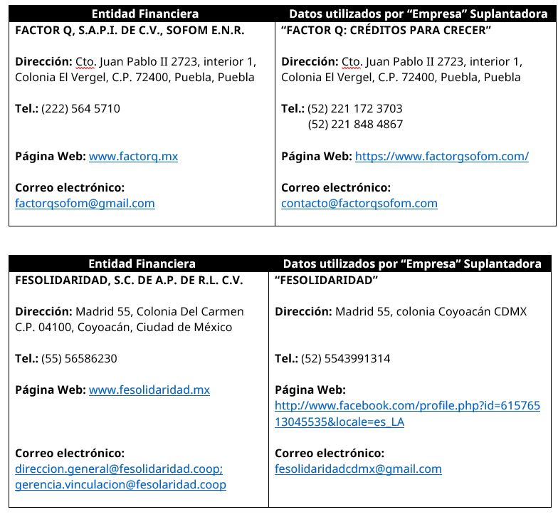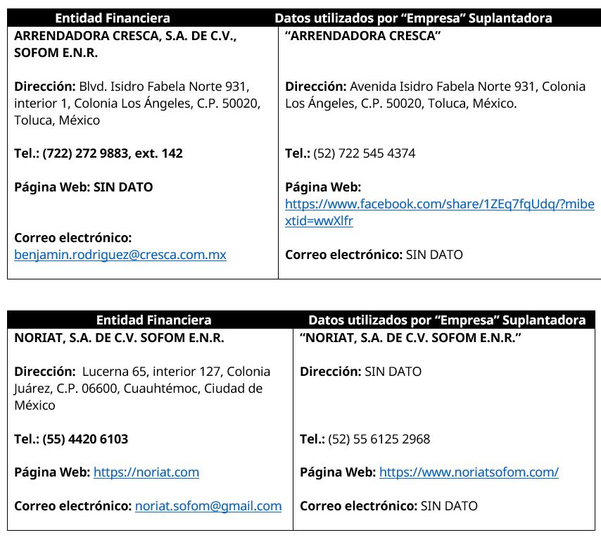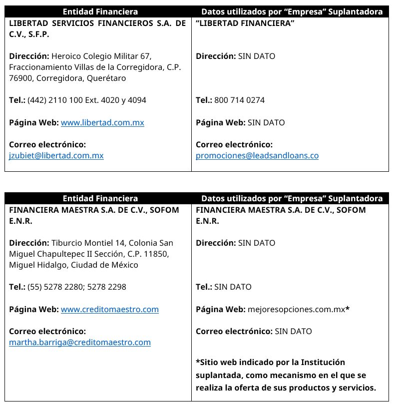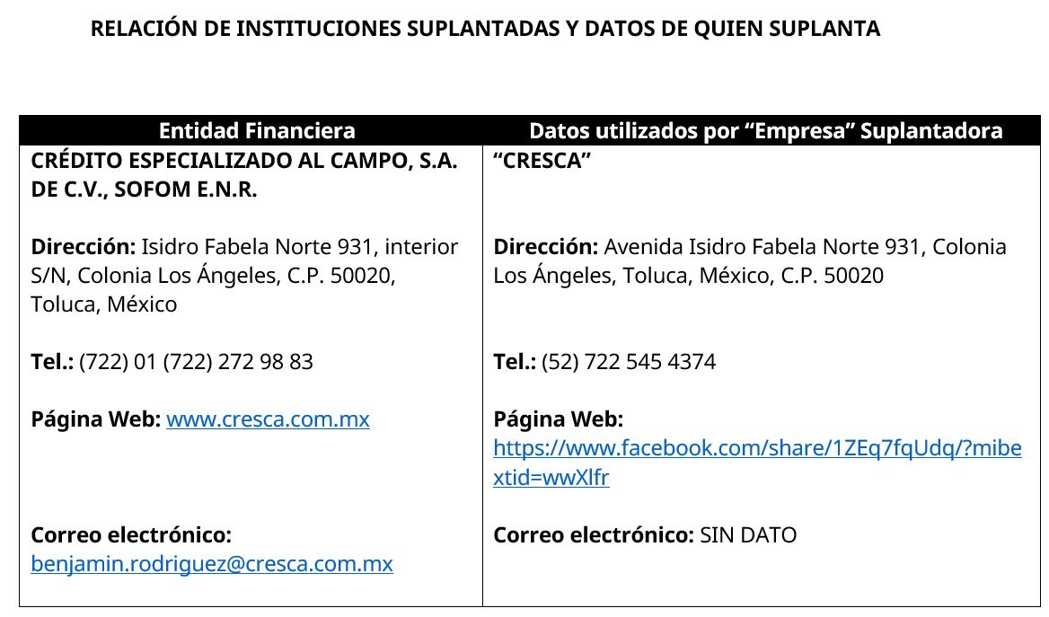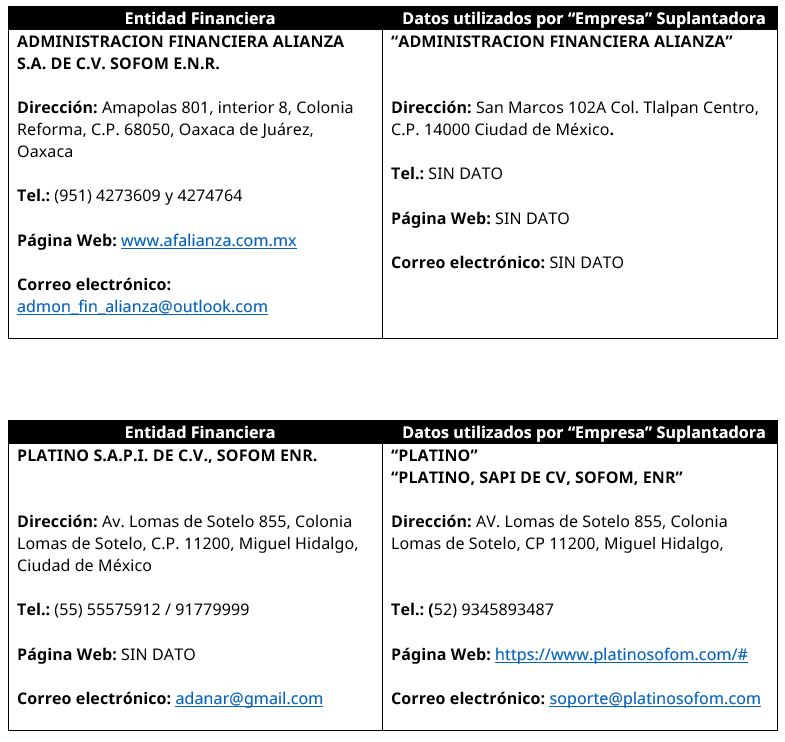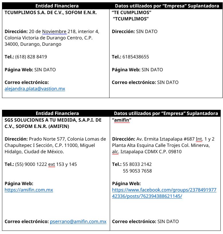debidamente constituidas e inscritas en el Sistema de Registro de Prestadores de Servicios Financieros (SIPRES), han informado/notificado a esta autoridad de la suplantación de identidad (razón/denominación social) de entidades financieras, presuntamente realizada por personas físicas o “empresas”, que buscan afectar económicamente o engañar a quienes requieren de un crédito (servicios financieros), utilizando indebidamente su nombre y/o logo y/o denominación a través de medios de comunicación (impresos o digitales).