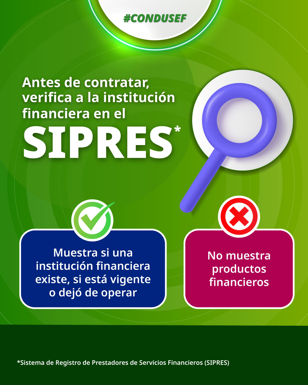 Hay que destacar que en el SIPRES no se consultan productos financieros (créditos, seguros, inversiones o rendimientos). El registro muestra únicamente información de la institución, no de los productos que ofrece.