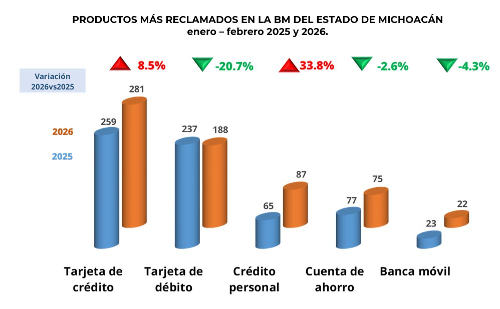 Durante el primer bimestre 2026 el estado de Michoacán concentró el 2.3% de las reclamaciones a nivel nacional, los 1,089 casos atendidos reflejaron un decremento del 3.3% en comparación con el año anterior.