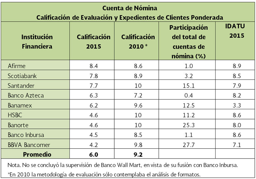 Del resultado de la evaluación de formatos y la supervisión de expedientes de clientes de las 9 instituciones bancarias consideradas, se obtuvo una calificación promedio de 6 sobre una máxima de 10 puntos y todos por abajo de la lograda en el año 2010.