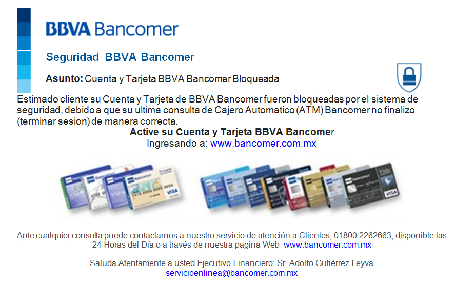 Ante la posibilidad que piratas cibernéticos puedan acceder a datos personales de clientes del servicio de banca electrónica, la Comisión Nacional para la Protección y Defensa de los Usuarios de Servicios Financieros (CONDUSEF), emite una nueva alerta por un correo falso que circula por la red, presuntamente enviado por BBVA Bancomer.