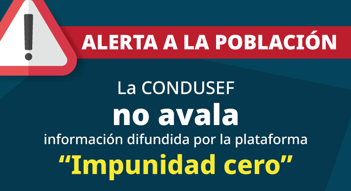 La CONDUSEF informa a la población que no avala, respalda ni participa en la información difundida a través de la plataforma Impunidad Cero, en particular en el contenido titulado -Impunidad Cero presenta la Guía para denunciar fraudes cibernéticos-, ni en los sitios web www.impunidadcero.org y www.denuncia.org.