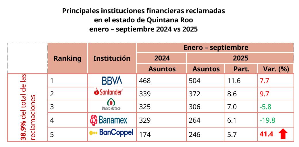 Las principales causas de reclamación de enero a septiembre de 2025 fueron: los consumos no reconocidos, la actualización de historial crediticio no realizada y la transferencia electrónica no reconocida, las cuales en conjunto representaron el 25.2% de las quejas en la entidad.