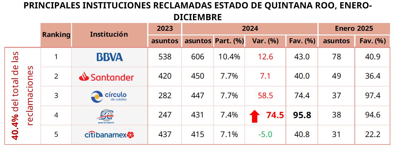 En 2024 se logró recuperar un monto de 31.9 millones de pesos, un 62.8% másque en 2023. Para enero de 2025 se han recuperado 1.5 millones de pesos. Los productos más reclamados fueron la tarjeta de crédito, la tarjeta de débito y el reporte de crédito especial, que en conjunto representaron el 50.4% del total en esa entidad.