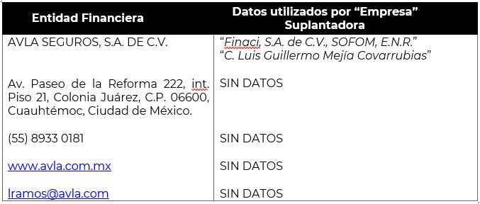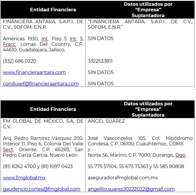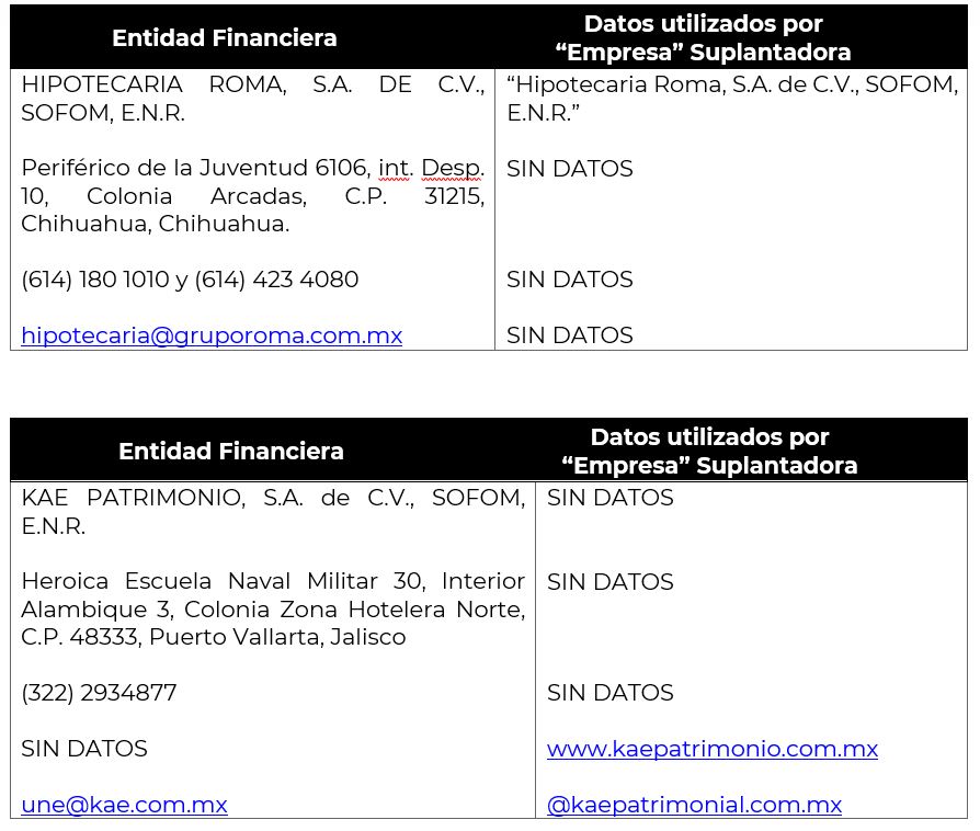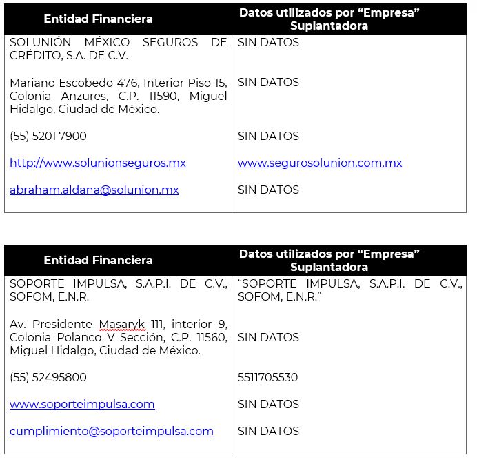 RELACIÓN DE INSTITUCIONES QUE HAN INFORMADO SER SUPLANTADAS Y DATOS PROPORCIONADOS RESPECTO DE TERCEROS QUE PRESUNTAMENTE SE OSTENTAN COMO ENTIDAD O TERCEROS QUE SEÑALAN ESTAR RELACIONADOS CON ESTOS: