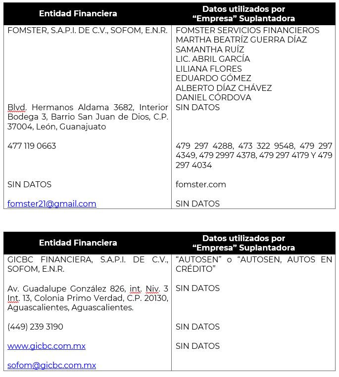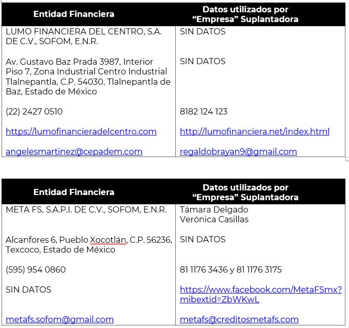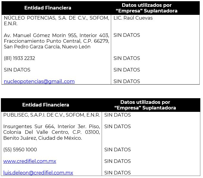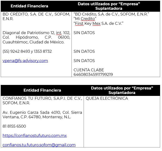Durante este año esta Comisión Nacional cuenta con reportes de 20 instituciones financieras que habían sido afectadas por la suplantación o uso indebido y sin autorización de su nombre comercial, denominación, logo e incluso de algunos de sus datos fiscales o administrativos, detalladas a continuación: