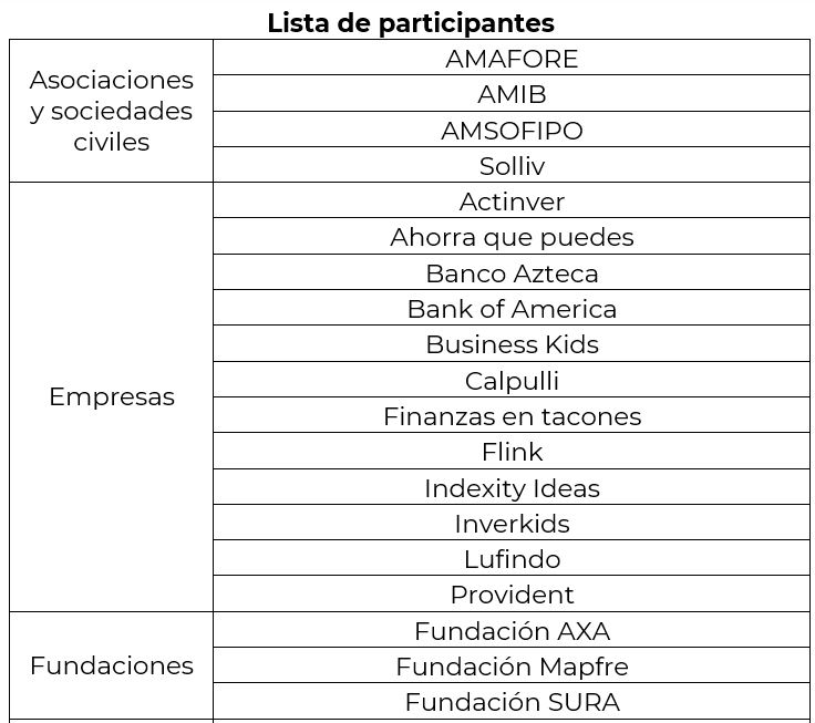En 2021, sólo en México, los eventos relacionados a la Global Money Week tuvieron un alcance de más de 735,000 personas, para 2022 se contempla superar esta cifra. En esta edición se sumarán más de 40 instituciones participantes, desde instituciones educativas y financieras, órganos autónomos, expertos en finanzas, influencers, además de otras empresas de todo el país, todas y todos con el objetivo de unir esfuerzos para organizar actividades educativas de alto valor y con acceso gratuito.