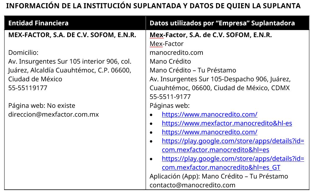 De acuerdo con la información recibida, a mediados del mes de diciembre de 2025 se detectó la existencia de una página web y una aplicación disponible en Google Play en la que se hacen pasar indebidamente por MEX-FACTOR, S.A. DE C.V. SOFOM E.N.R.