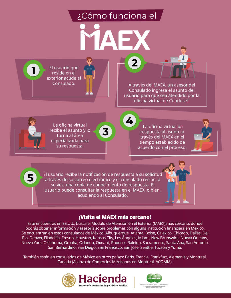 Si te encuentras en Estados Unidos, busca el Módulo de Atención en el Exterior (MAEX) más cercano, donde podrás obtener información y asesoría sobre problemas con alguna institución financiera en México.
